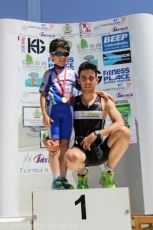 Darío Vaquero Florez afronta el tramo sobre ruedas con fuerza y dominio de la bicicleta recortándoles mucho tiempo a los tres primeros de categoría superior hasta la siguiente transición ( cambio de bici a carrera a pie)  donde enfoca la última parte de carrera con tanta energía que  termina en primera posición en categoría prebenjamín, y tercera  posición absoluta,adelantando a sus competidores mayores de categoría benjamín.