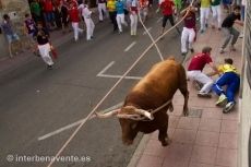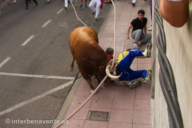 Sonaba la tercera bomba en el Toril cuando Quite pisaba suelo benaventano, salía rápido de la zona de la salida y enseguida enfilaba camino rumbo a la Calle Matadero, Plaza de Mayor y Calle La Rúa, una de las más importantes donde los mozos "luchan" por conseguir una buena carrera, Quite ha destacado por su buen trote en la primera parte del recorrido, pero fue llegar a la primera argollla cuando el astado comenzó a aflojar, aún así consiguió retomar el ritmo de carrera, bajando por la calle de los Carros donde dió un pequeño revolcón a tres mozos, sin consecuencias.