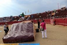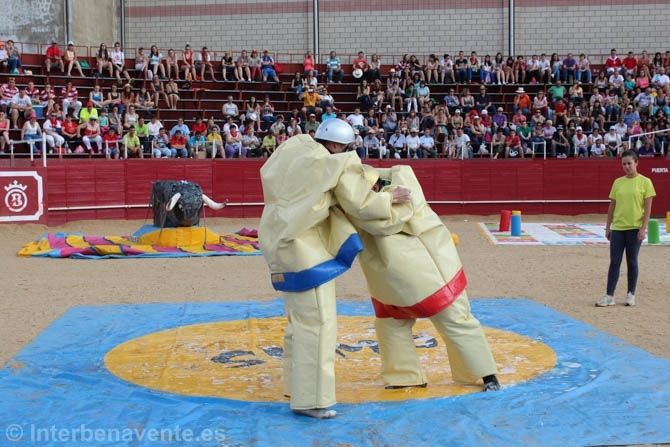 Miembros de las Peñas Oficiales del Toro Enmaromado se enfrentaban a divertidas pruebas rescatadas del mítico programa de televisión Grand Prix, los rulos, la lucha de sumos o la carrera de sacos refrescaban la mente de los espectadores que llenaban medio aforo de la plaza de toros.