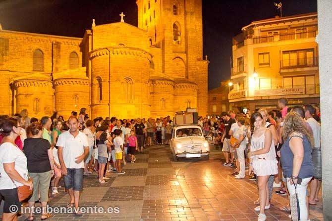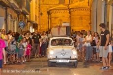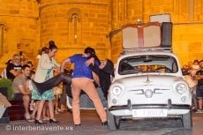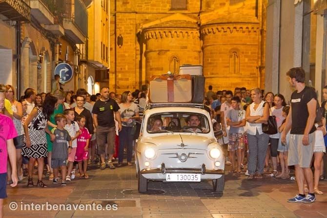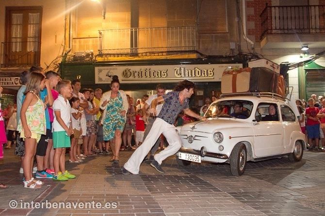 Un Seat 600, con mucha sobrecarga, se convirtió también en protagonista de este recorrido por la calle de la Rúa y la calle Herreros, sus inesperadas paradas iban dando forma a la obra y provocando la participación del público que vivia la historia de los personajes en primera persona.