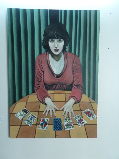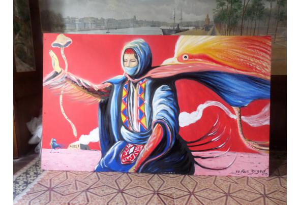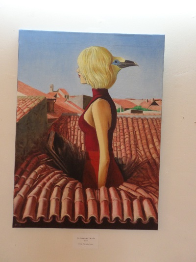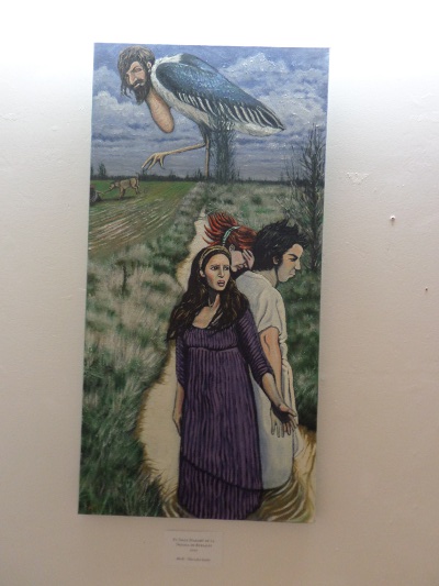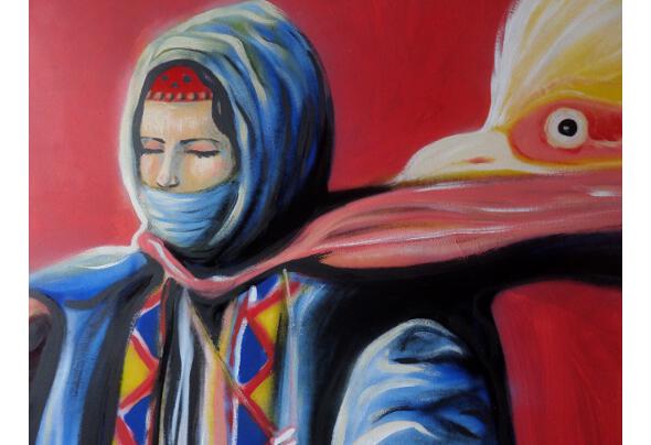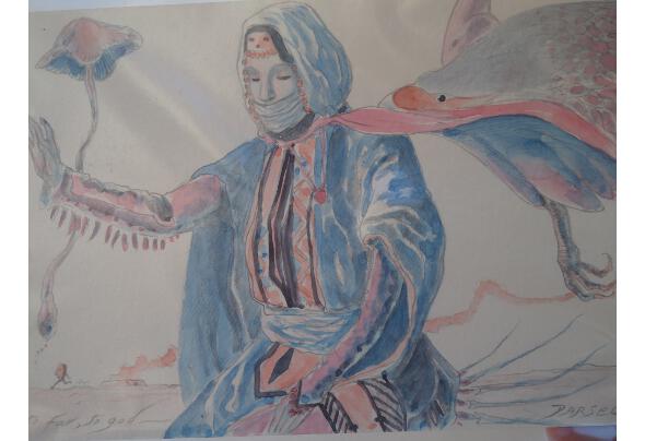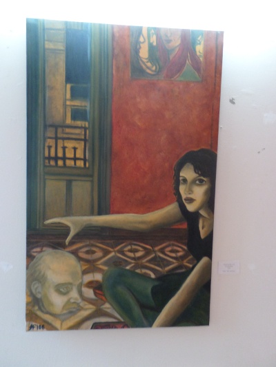 Estuve viéndolo al comienzo de su trabajo y tuve en mis manos el diseño de su primera pintura, cuyo resultado final fue el que vemos a aquí. Una mujer con la cabeza cubierta, y junto a ella algunas figuras de seres vivos, utilizados por él, en este caso un águila u otro ave de rapiña cuyo pico llega hasta su pañuelo o turbante, y sobre el brazo o la mano un especie de ser marino…..