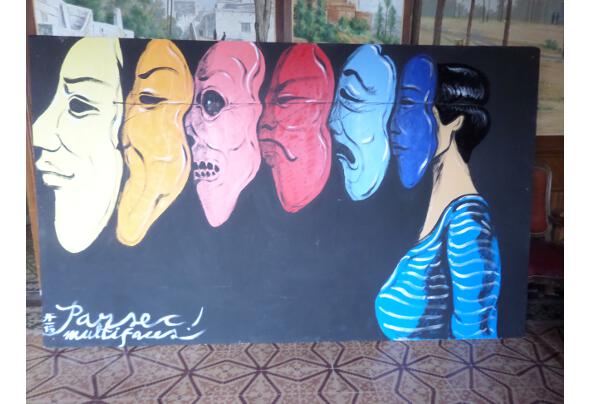 Por su parte en el otro panel nos muestra el torso de una joven bien peinada y con máscara o careta sobre su rostro, máscara que repite cinco veces más. Lo titulaMultifaces, la joven de las varias caras, o caretas.
