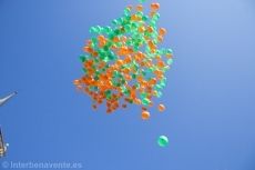 Presidiendo la Plaza un ramo de globos que se soltaron al aire con los colores de la Fibrosis Quística, verde y naranja, y un manifiesto de sus compañeros y amigos en recuerdo de Alberto.