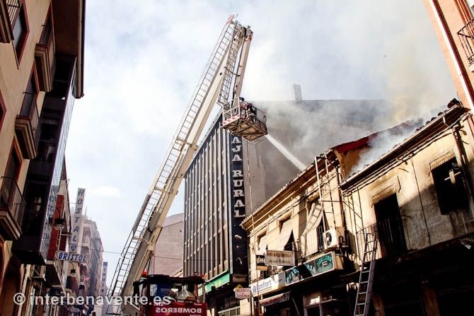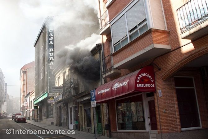 Tres dotaciones del Parque de Bomberos de Benavente se encargaron de controlar el incendio, que inicialmente afectaba en su totalidad al número 29, pero que a través de los tejados se comunicó también al número 27, que ha visto afectada toda su cubierta y desván, además de los daños producidos en la estructura de madera, según una primera valoración.