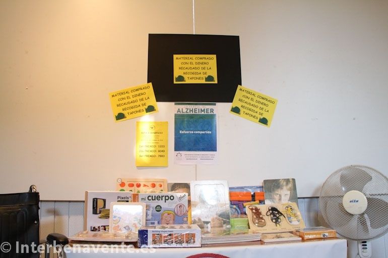 La Presidenta de la Asociación, Asunción Rubio presentó la silla de ruedas y el material pedagógico adquirido con la venta de los 3.500 kilos de tapones solidarios recolectados, y anunció que se seguirá con esta campaña en la que tan activamente están participando muchas personas de Benavente y Comarca.