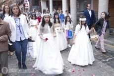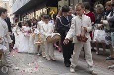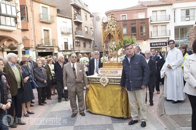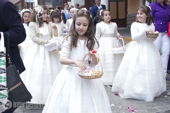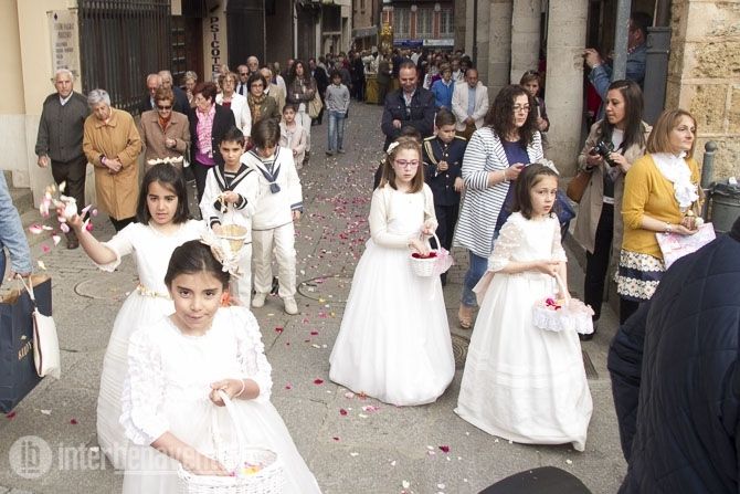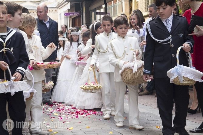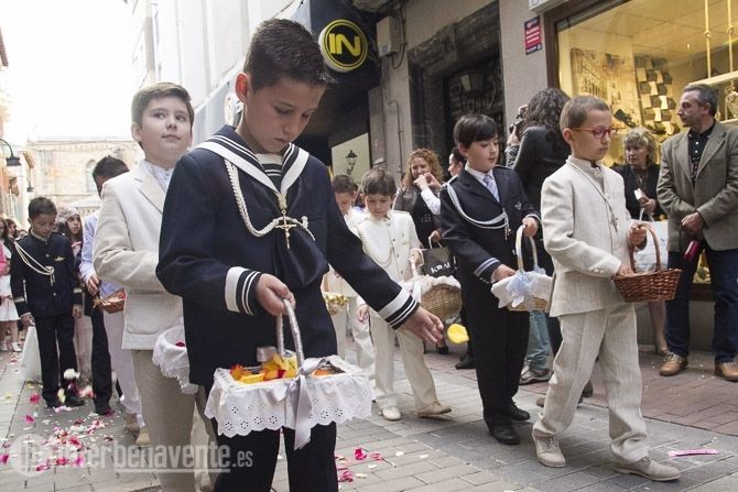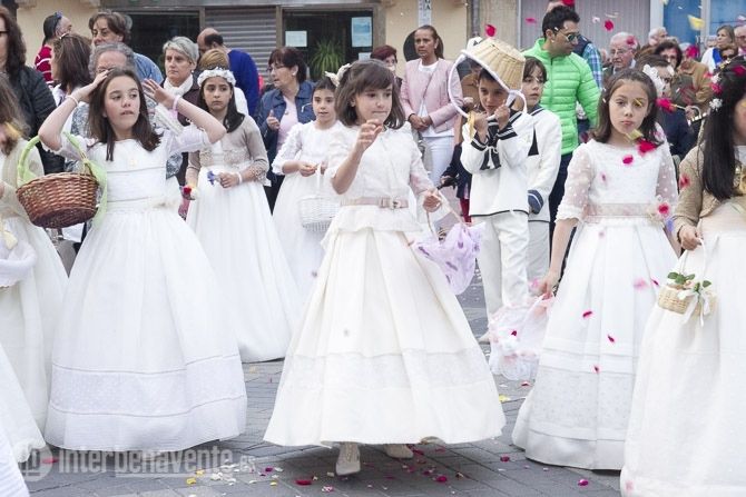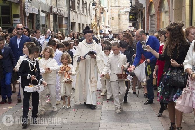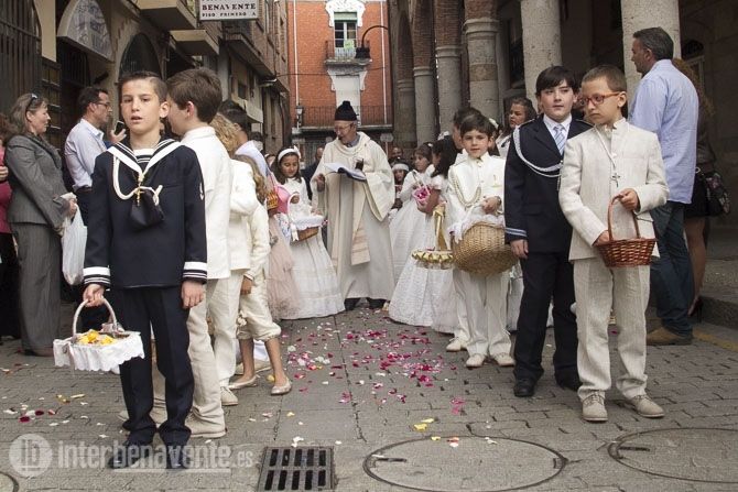 Una treintena de niños, con sus trajes de comunión, asistieron a la misa de celebración del Corpus en la Iglesia de Santa María la Mayor y posteriormente a la tradicional procesión por el centro de Benavente