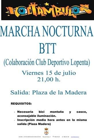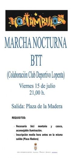 La concejalía de Juventud, dentro del programa denominado Noctámbulos, organiza este viernes día 15 la marcha nocturna BTT. Todos los interesados podrán realizar la XI Marcha nocturna BTT, que la Concejalía programa junto con el Club Deportivo Lopenta, cuya salida tendrá lugar a las 21:30h de la Plaza de la Madera.