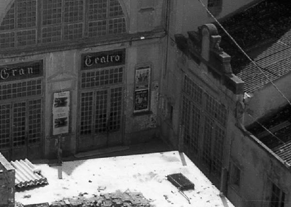 Y sobre este montante una vidriera de cristales emplomados en tonos azules y cenefas curvas rojas en la que vemos un rótulo con el nombre de GRAN TEATRO en letras góticas blancas….