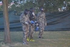 Los chavales se dividieron en grupos de cuatro y entraban al campo dos equipos cada vez: azules y camuflados. El objetivo era claro: conseguir la bandera, pero por el camino evitar que te dieran y disparar al equipo contrario.