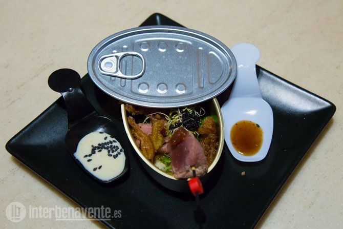 Bajo un plato con fondo negro, ante el comensal se presenta “Caputaki” una tapa elaborada por el Bar Capuchino que consiste en un tataki de atún rojo, son sésamo y ajo blanco.