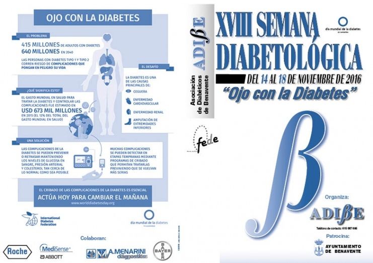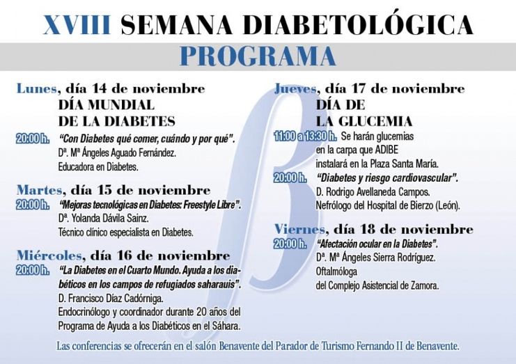 La Asociación de Diabéticos de Benavente (ADIBE) organiza la XVIII Semana Diabetológica que tendrá lugar entre los días 14 al 18 de noviembre, con motivo de la celebración del Día Mundial de la Diabetes, que se celebra cada 14 de noviembre, y que lleva por lema este año “Ojo con la Diabetes”.