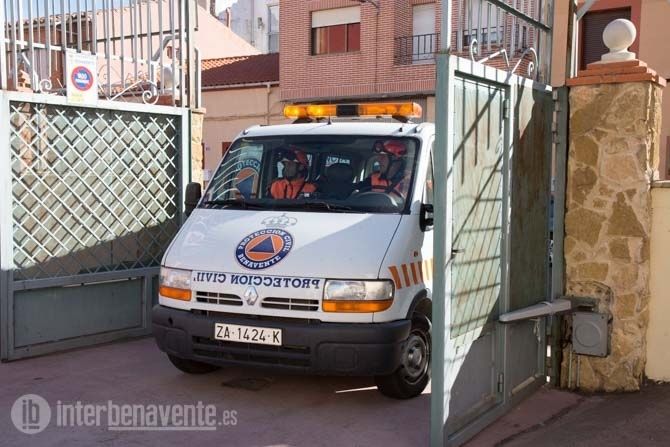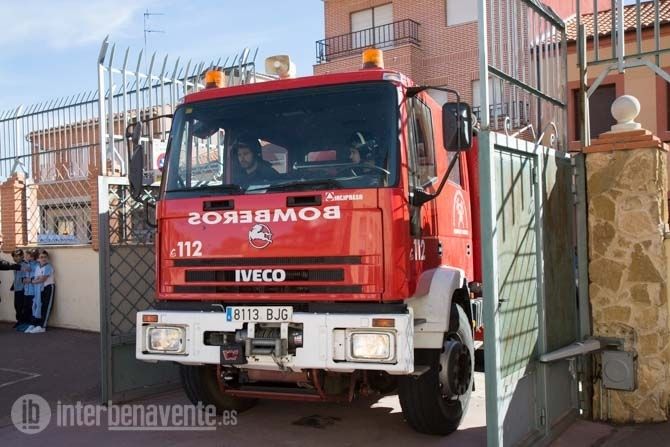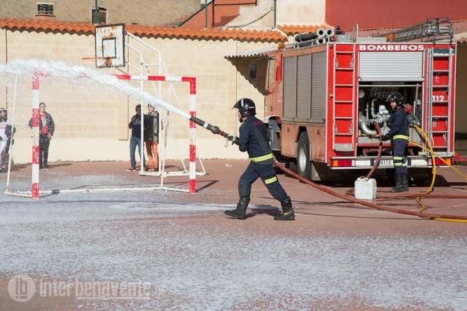 Los bomberos de Benavente y Protección Civil hacían su entrada en el recinto, mientras que los voluntarios de Protección Civil recorrían las aulas y los pasillos para asegurarse que no había quedado ninguna persona en el interior, los bomberos preparaban las mangueras para realizar una simulación con espuma y agua.