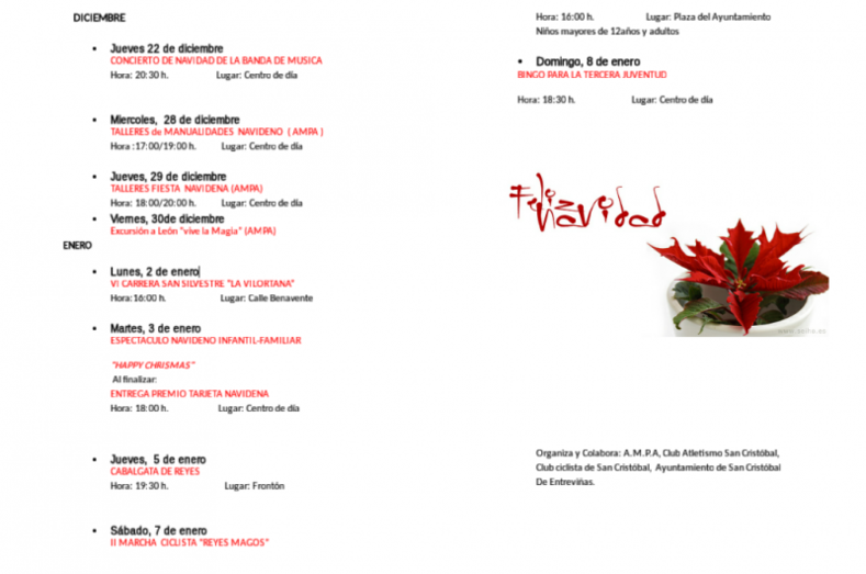 Comenzarán las actividades con un concierto de navidad a cargo de la Banda de Música. También habrá talleres de manualidades y fiesta navideña, alguna excursión, incluso Bingo. Una serie de actividades para que la gente pueda disfrutar de estas fiestas en San Cristóbal de Entreviñas.