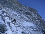 Esa tarde comprobamos la entrada a la vía para saber movernos por la noche. A las 3 AM salimos siguiendo una huella algo borrosa que más adelante desapareció dejándonos en la oscuridad sin saber muy bien a dónde ir. Apostamos por atravesar una rimaya y tirar para arriba y, tuvimos suerte, estábamos en la primera rampa de nieve de 300 m de desnivel. Pues resultó que esta supuesta rampa de nieve ahora era de hielo negro y roca expuesta cubierta por nieve blanda. Ésta fue la temática de toda la ruta. Avanzamos algún tramo en ensamble pero al poco tuvimos que hacer largos. Hacia la tarde llegamos a la entrada del diedro oblicuo. Con la posibilidad de retirarnos desde allí al Solvay decidimos continuar, ya que a pesar de las condiciones íbamos avanzando, y además ¿para qué habíamos subido si no el equipo de vivac? Escalamos gran parte del diedro hasta que se hizo de noche. Ante la impotencia de no encontrar un solo sitio donde vivaquear, Fernando talló una repisa en la nieve. Fue una noche infernal en la que no paraba de caernos nieve encima y en la que perdimos la funda de vivac de Fernando con su cantimplora y mi esterilla. Ambos ya habíamos perdido los dos Reversos… menuda broma.