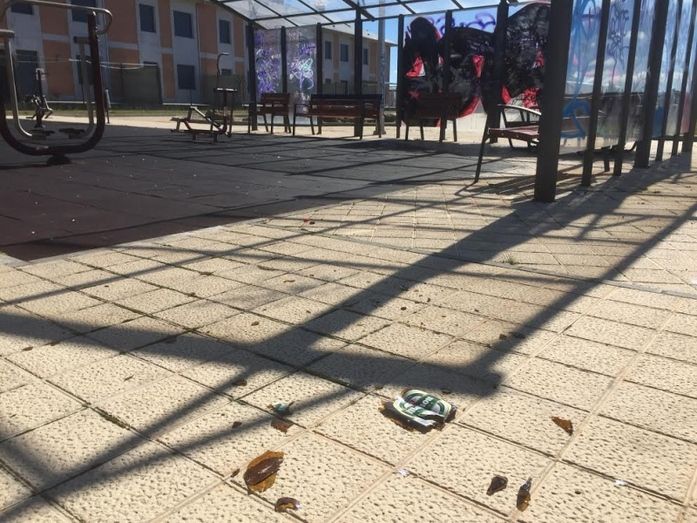 Explican que faltan varios metacrilatos que protegen la zona donde se sienta la gente del viento, y lo que hay están llenos de pintadas. También se pueden encontrar defecaciones de perros en el césped, restos de botellas y cristales rotos, arquetas sin tapaderas…