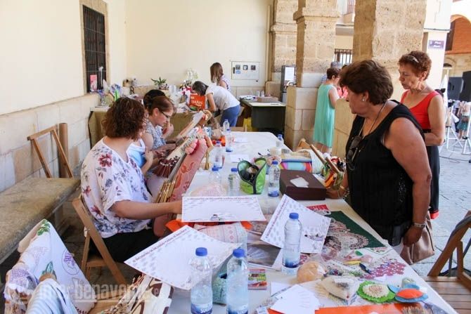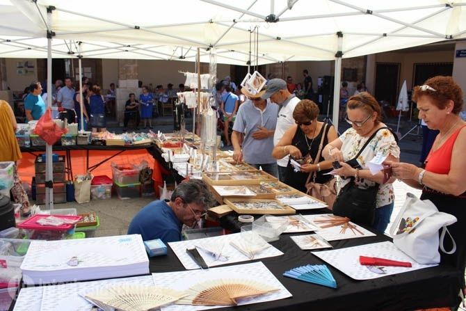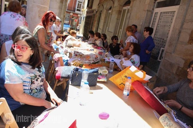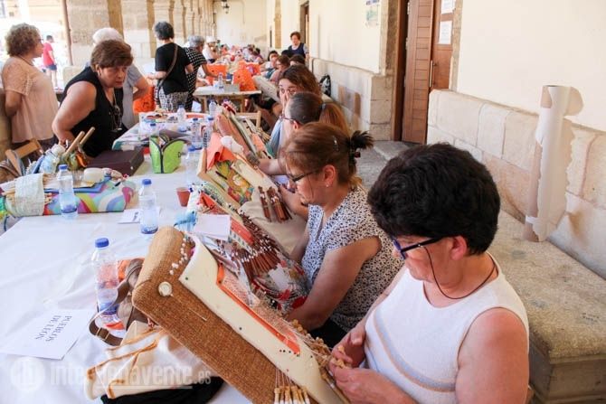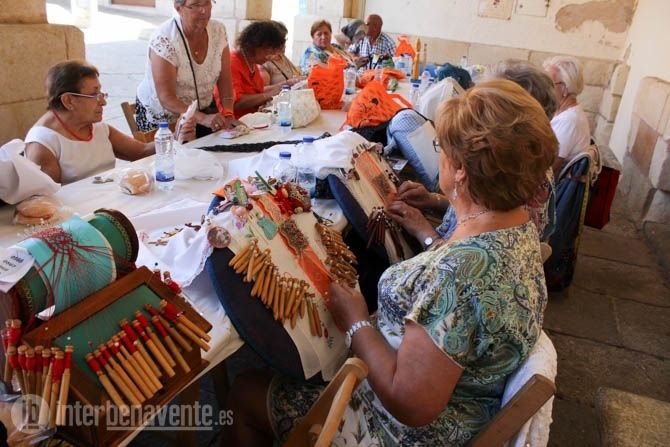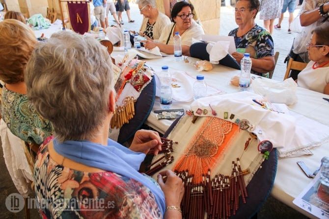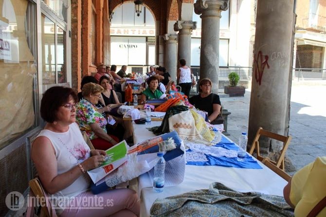 El tiempo acompañaba a este encuentro, ya consolidado en la agenda de actividad del Verano Activo, que alcanzaba su décimo primera edición con participación de encajeras de Valladolid, León, Salamanca, Ávila y Ponferrada, que durante las 10:00 de la mañana hasta las 14:00 horas han invadido los soportales de la Plaza Mayor, para resguardarse del calor, y han comenzado a realizar las obras de arte mediante encaje de bolillos y costura.