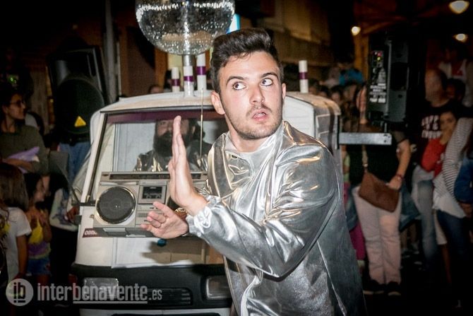 El espectáculo, que tuvo lugar en la noche del pasado viernes, comenzó en la Plaza de Santa María donde comenzó la andadura musical del espectáculo “Odisea 80”. Cinco actores y una antigua motocicleta de tres ruedas con remolque recorrieron la calle Herreros hasta llegar a la Plaza Mayor envueltos en un ambiente musical y estético típico de esta década.