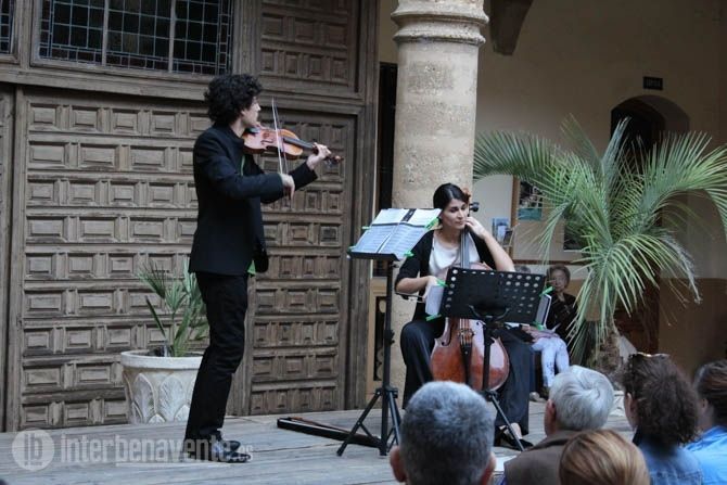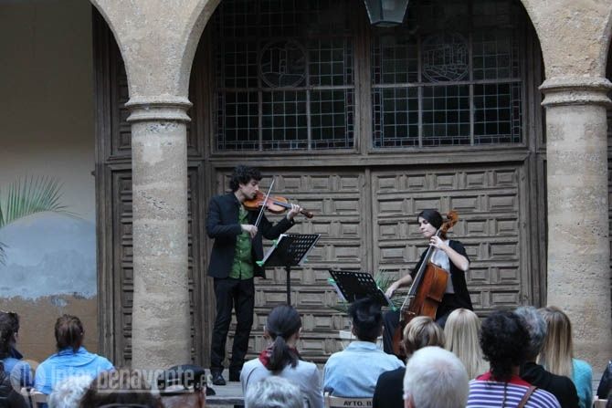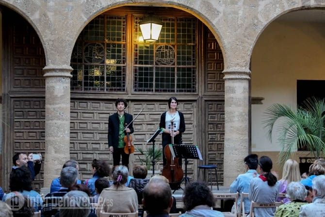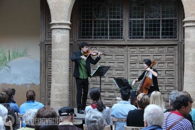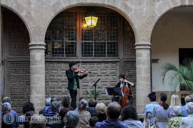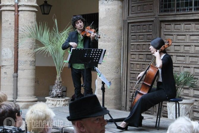 Las sillas se disponían en el centro del patio del Hospital de la Piedad para el numeroso público que se congregaba en este concierto de cuerda entre un violín y un violonchelo. A pesar del frío que se quedó el día no restó afluencia aguantando estoicamente tanto los dos músicos como el público, muchos de ellos buscando refugio del viento frio entre los soportales del patio.