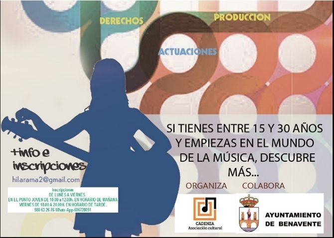 La concejalía de juventud del Ayuntamiento de Benavente y la Asociación Cultural Cadenza, realizarán del 11 al 15 de septiembre una serie de charlas y actividades destinadas a jóvenes que quieran ampliar conocimientos sobre el mundo de la música y nutrirse de la experiencia de los ponentes que las instruyen, con el fin de potenciar la creatividad y motivar a los asistentes a las jornadas a realizar proyectos musicales en conjunto o solitario en la ciudad y alrededores.