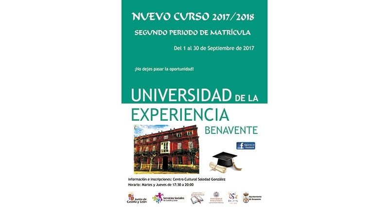 La Universidad de la Experiencia de Benavente abre su segundo plazo de matrícula para el nuevo curso académico 2017/2018. El periodo de matrícula permanecerá abierto del 1 al 30 de Septiembre de 2017.