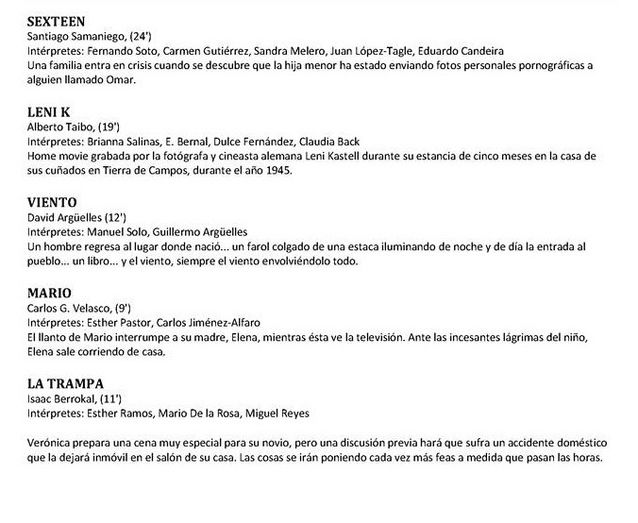 Este programa forma parte de las categoráis de la Seminci de Valladolid, por lo que los cortos que podremos ver esta tarde en la Casa de Cultura son los 5 que fueron seleccionados para la Edición de 2016.
