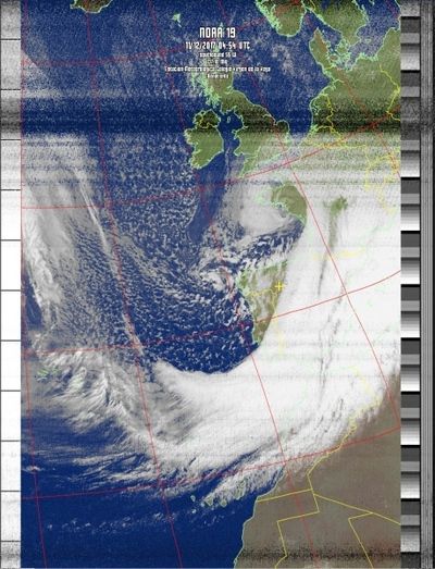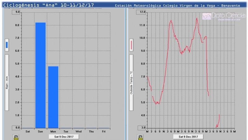 Añaden que sin embargo no se caracterizó en nuestra ciudad por dejar abundantes lluvias, unos discretos 12.6 litros. Una temperatura en torno a los 10ºC se mantuvo hasta que pasó el frente cálido asociado, para descender rápidamente en la jornada del lunes, tal como se aprecia en las imágenes del satélite tomadas por la estación y la gráfica de temperaturas.