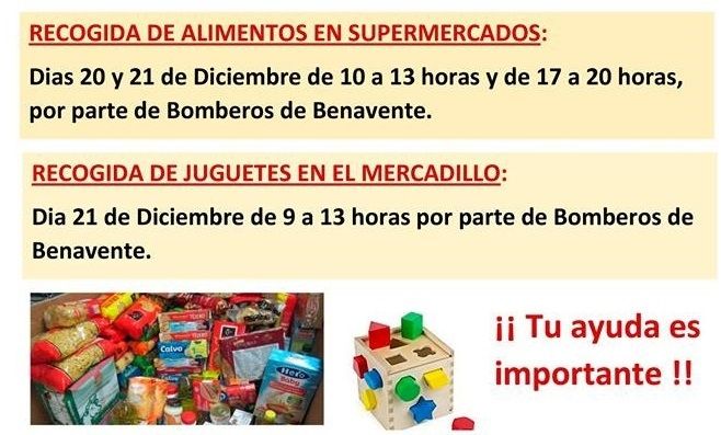 Mientras que la recogida de juguetes en el Mercadillo tendrá lugar el 21 de diciembre de 9:00 a 13:00h también por los miembros del Parque de Bomberos de Benavente.