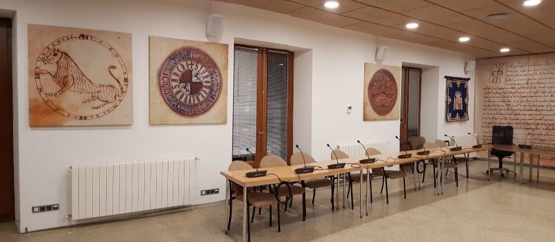 La sala se ha habilitado con una zona para los medios de comunicación, otra para el público asistentes y varias meses para la Corporación Municipal, con la cabecera de la Carta Puebla y flanqueados con los escudos de los Condes de Benavente, y el sello de Fernando II en el fuero de León.