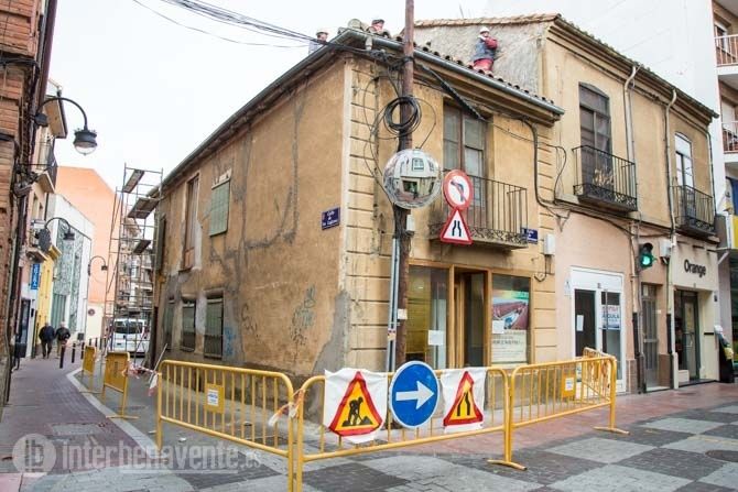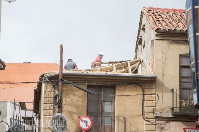 La Calle Lagares permanece cortada al tráfico y algunos operarios ya se encuentran trabajando en la retirada de tejas de la cubierta de esta inmueble, para posteriormente, se espera, continúe con los trabajos de derribo de la edificación declarada en ruina.