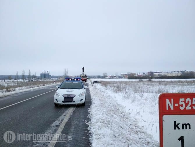 Debido a la nevada caída esta mañana y que está remitiendo, la N-525 a su paso por Benavente y a la altura del Campo de Fútbol Luciano Rubio, presentaba placas de hielo, motivo de la salida de vía de un vehículo, y que ha sido necesaria una grúa para poder remolcarlo.