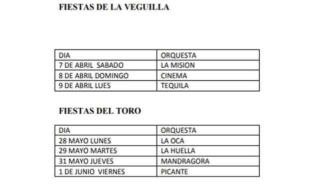 Para las fiestas de la Veguilla se han programado tres orquestas y para la Semana Grande del Toro Enmaromado, la concejalía de Fiestas, organiza cuatro verbenas.