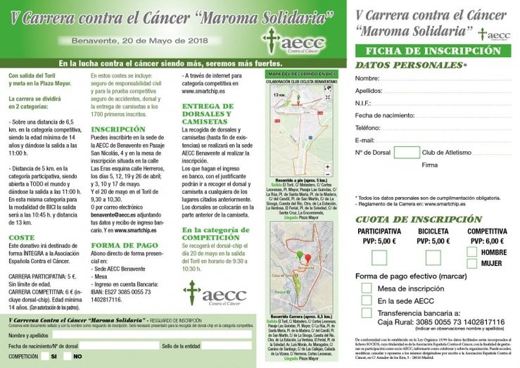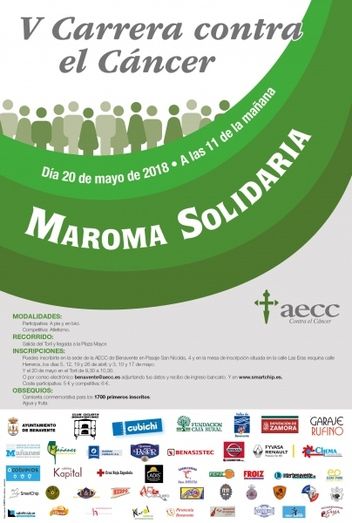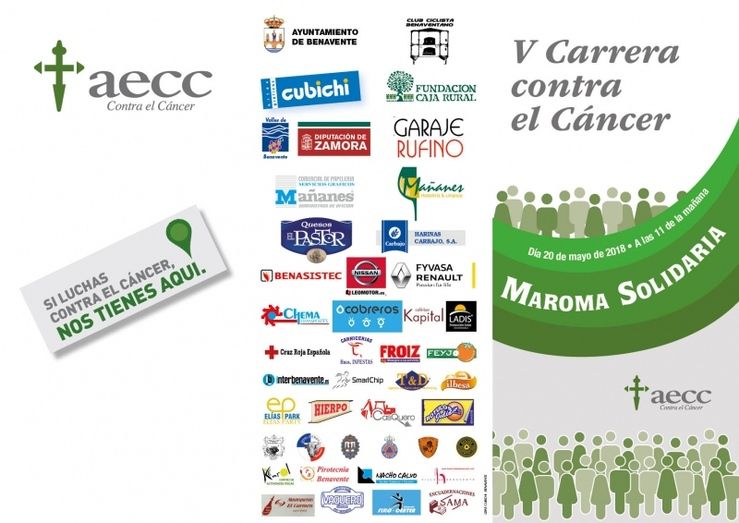 La Junta Local contra el Cáncer de Benavente organiza un año más la carrera contra el cáncer “Maroma Solidaria”, que alcanza su quinta edición en 2018. La Presidente de la asociación, Asunción Alonso, explicaba que se volverá a contar con tres modalidades para abrir la participación a todos los ciudadanos, por un lado participativa o a pie, en bicicleta y competitiva (atletismo), con diferentes itinerarios acordes a cada modalidad.