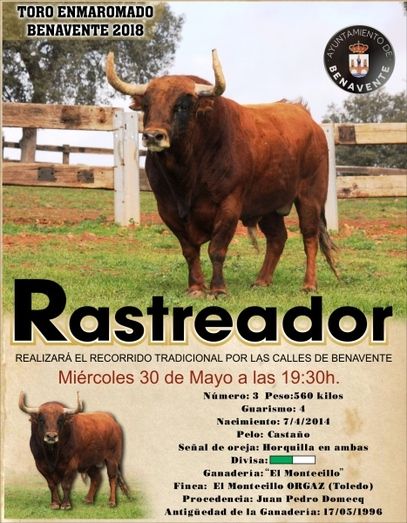 El Ayuntamiento de Benavente no quiso esperar más y tras otorgar el Alcalde el Toro Enmaromado se desplegaba la pancarta para dar a conocer al astado de este año. Su nombre es Rastreador, pesa 560 kilos y nació el 7 de abril de 2014, de pelaje castaño, encaste de Juan Pedro Domecq y procede de la Ganadería el Montecillo de Orgaz en Toledo.