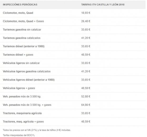 Tarifas Inspección Técnica de Vehículos en Castilla y León