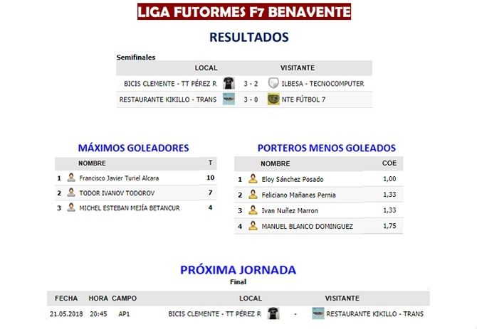 Tras disputar los dos encuentros de semifinales, la liga Futormes ya tiene a sus dos finalistas, el Bicis Clemente-TT Pérez R y Restaurante Kikillo-Trans se verán las caras esta tarde en el campo de césped artificial Alonso Pimentel.