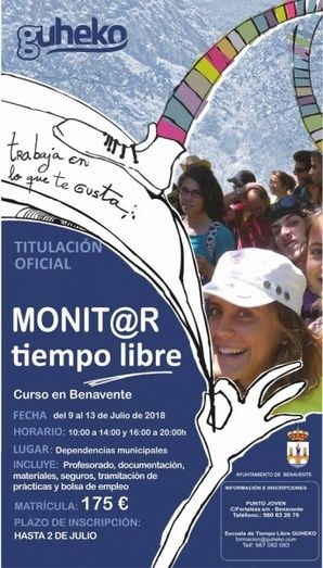 Desde la Concejalía de Juventud, se oferta, dentro de su programa formativo, el “Curso de Monitor de Ocio y Tiempo Libre”, en modalidad intensiva, con una duración total de 300 horas, de las cuales, 150h se ajustan a una parte teórica y 150h a la parte práctica. El curso será impartido por profesionales de la Escuela de Animación GUHEKO.