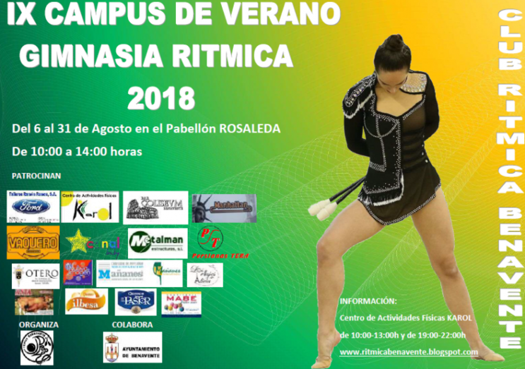 El Club Rítmica de Benavente organiza, con el apoyo del Ayuntamiento, un nuevo Campus de Verano que se desarrolla del 6 al 31 de agosto en el Pabellón de la Rosaleda de 10:00 a 14:00 horas.