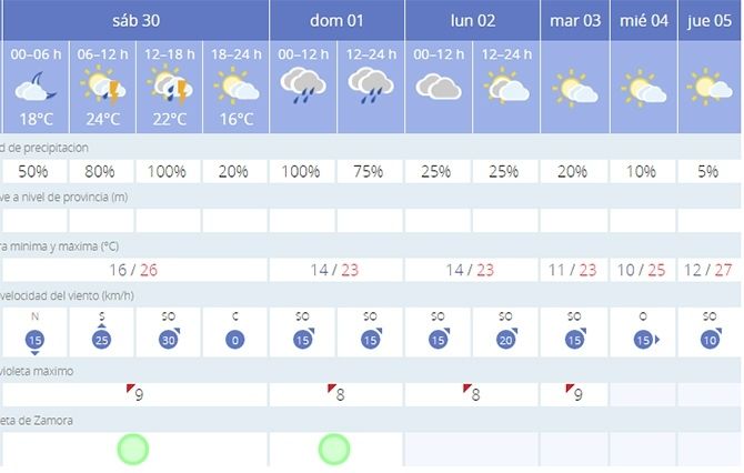 Aunque no se ha establecido ninguna alerta por fuertes lluvias, desde la Agencia Estatal de Meteorología informa que el porcentaje de tormentas para este sábado 29 de junio se establece en un 100% desde el mediodía hasta bien entrada la tarde, remitiendo a lo largo de la noche.