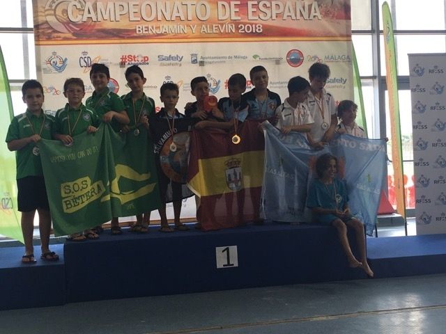 El equipo de los chicos formado por dos benjamines y dos alevines se proclamaron en la piscina campeones de España en la prueba 4x12,5m arrastre de maniquí y quintos en el relevo sprint de playa.