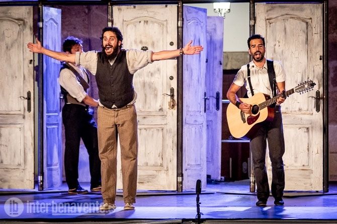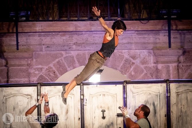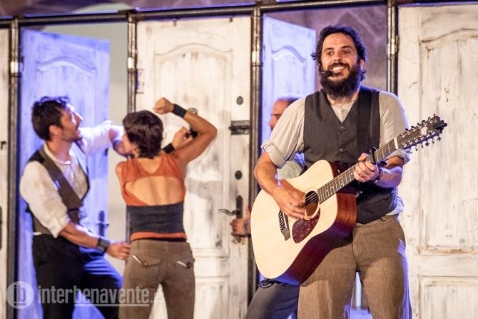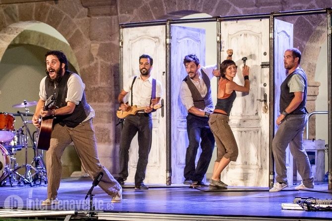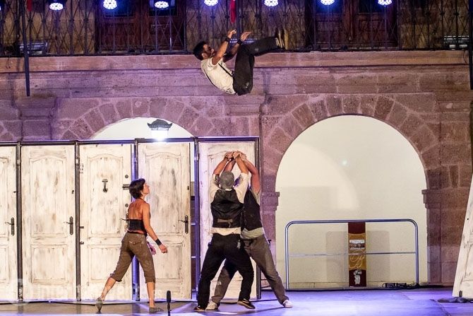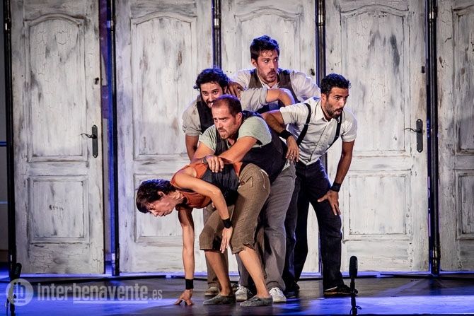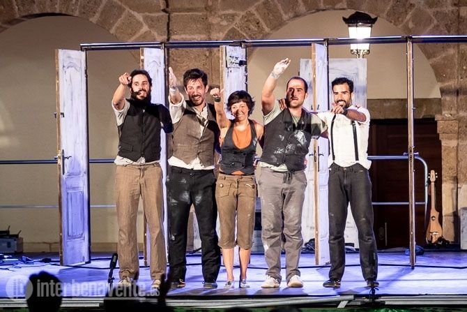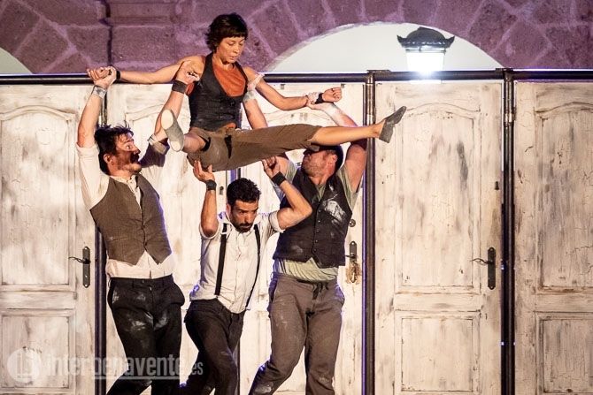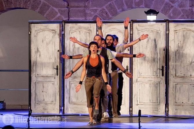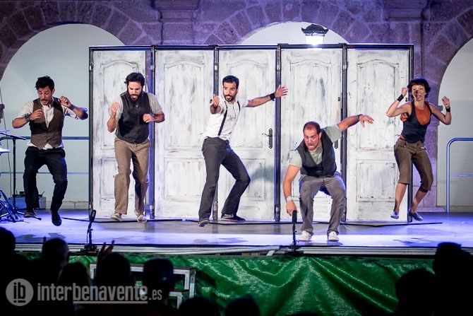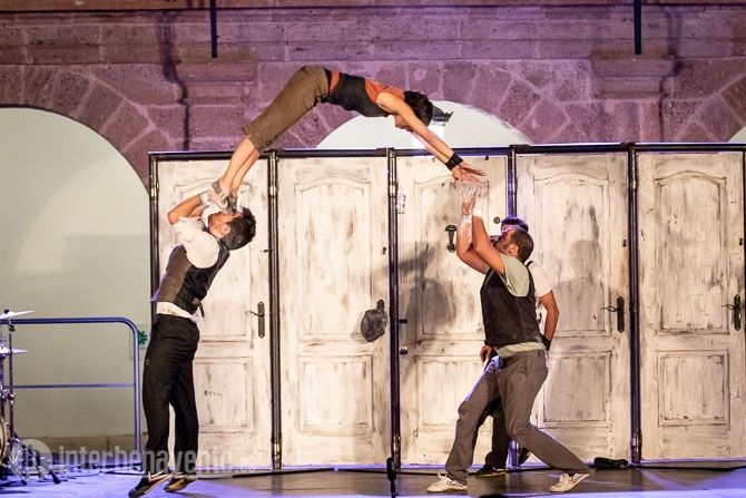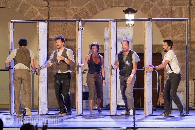 Malabares, Acrobacias, música, percusion y trabajo con puertas, único elemento escénico, para crear un espectáculo muy dinámico y visual, en el que también participó el numeroso público que acudió a la Plaza Mayor en una noche con temperatura muy agradable.