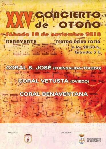 La Coral Benaventana nace en la primavera de 1991, promovida y apoyada por el Ayuntamienot de Benavente, que deseaba contan en su ciudad, donde siempre hubo gran tradición coralística, con esta manifestación cultural.   Desde su fundación, la Coral Benaventana está siendo dirigida por el profesor y director de música D. José Zaldo García, que fue quien diseñó y escogió las voces de esta coral. Este grupo coral, está compuesto por cuarenta voces mixtas repartids en cuatro cuerdas. Son amantes de la música polifónica que manifiestan a través del canto coral, todos ellos de varias edades y diversas profesiones.   Dispone de un variado repertorio, principalmente de folklore popular en constante renovación, compuesto por más de trescientas obras de estilos muy diversos y canciones populares de nuestra geografía. Pertenece a la Federación de corales FECORELE, habiendo participado en encuentros internacionales de corales, en los clásicos memoriales del zamorano maestro Antón, en diversos conciertos benéficos culturales a lo largo de nuestra comunidad, participó en el concierto pro-catedral de Burgos, en la Misa del Peregrino en la catedral de Santiago, organiza todos los años el Concierto de Otoño coincidiendo con la fiesta de Santa Cecilia y el Concierto de Villancicos en Navidad. Desde su fundación ha realizado intercambio con distintas corales de nuestra comunidad, habiendo actuado en Valladolid, Carrión de los Condes, Zamora, Burgos, La Bañeza, León, Mayorga de Campos, Santiago de Compostela, Pravia, Madrid, Aguilar de Campoo, Celanova, Sanabria, Verín, Bayon, León, Suances, etc. La Coral Benaventana fue elegida para cantar en las Edades del Hobre en Zamora, participó también en el 150 aniversario de la Fundación de la Banda de Música de Celanova (Orense), primera xuntanza de corais de Balón (Pontevedra). Ha cantado la misa en conmemoración del VIII Centenario de Las Cortes en Benavente. El año 2007, fue invitada para cantar en el día de las Fuerzas Armadas junto a la Unidad de Música de la Guardia Real y otras dos corales, en la ciudad de león, participó en la  XXIII muestra de corales en Medina de Rioseco, II muestra polifónica "A orillas del Pisuerga" (Valladolid), primer encuentro de corales de la Villa madrileña de Pinto. Ha participado en el V encuentro Coral de Habaneras y Canción Marinera de Gijón y en el Concierto "Letras Gallegas", celebrado en Bueu (Pontevedra), dando un concierto íntegramente en gallego.   La Coral Benaventana fue elegida por el Ayuntamiento de la ciudad para presentar el Himno a Benavente, cuyo director fue quien compuso la música.     Director: D. José Zaldo García   Preci entrada: 3€