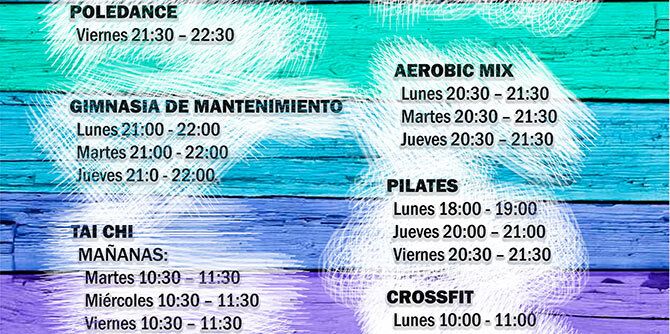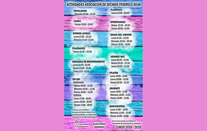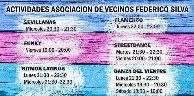 La Asociación ha programado las siguientes actividades: Sevillanas, flamenco, funky, streetdance, ritmos latinos, danza del vientre, poledance, gimnasia de mantenimiento, aerobic mix, taichi, pilates, crossfit y body control.