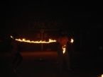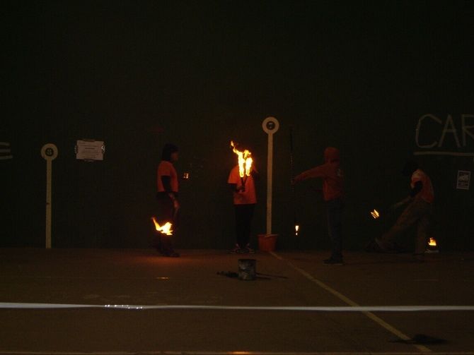 Eran las 20:00 horas cuando en el frontón de la Rosaleda se concentraban varios jóvenes dispuestos a aprender como hacer malabares con un complemento atractivo a mayores, el fuego.