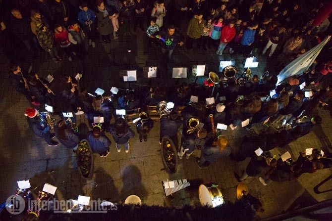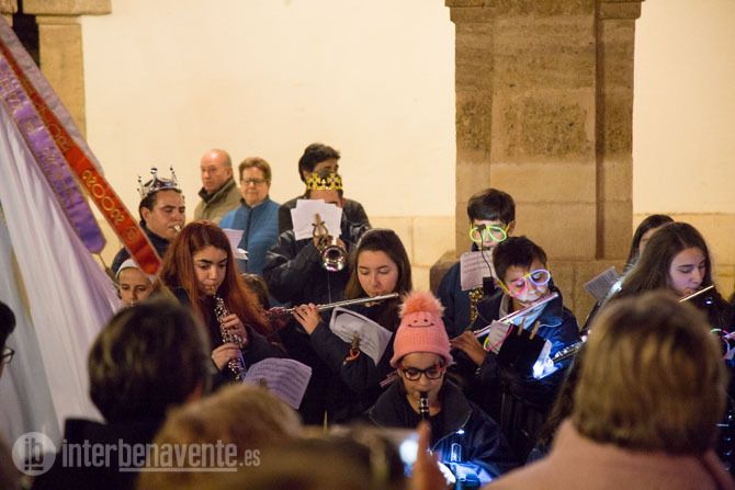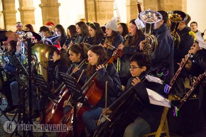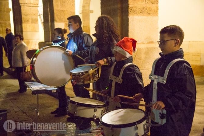 La Plaza Mayor de Benavente quedaba a oscuras para dar paso a las primeras notas musicales de la Banda Maestro Lupi, que actuaba como antesala del encendido navideño, mientras la Plaza Mayor se llenaba de asistentes para conocer las sorpresas que les deparaba este acto organizado por la Concejalía de Fiestas.