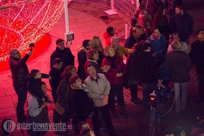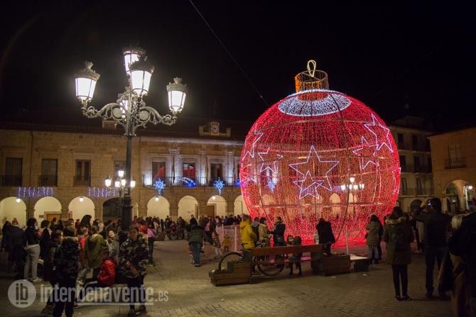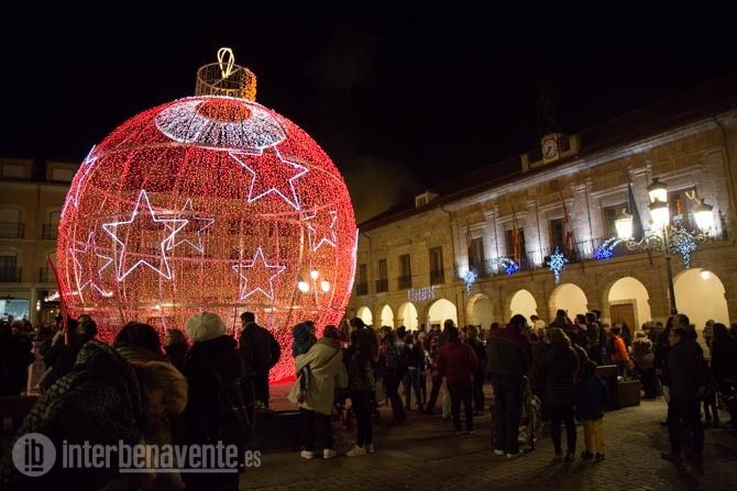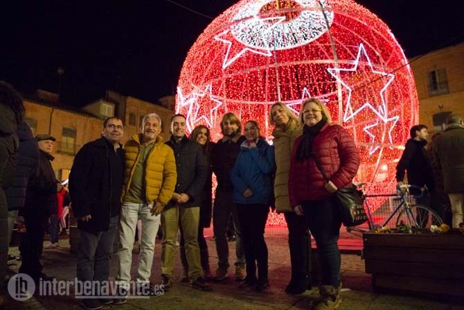 En el centro de la Plaza una gran bola de Navidad esperaba a su encendido por el Alcalde de Benavente, Luciano Huerga, quien procedía a dar al interruptor, momento en el que se iluminaba de rojo y blanco la bola de Navidad y todos los adornos luminosos de la fachada de los Ayuntamientos y las Calles del centro.