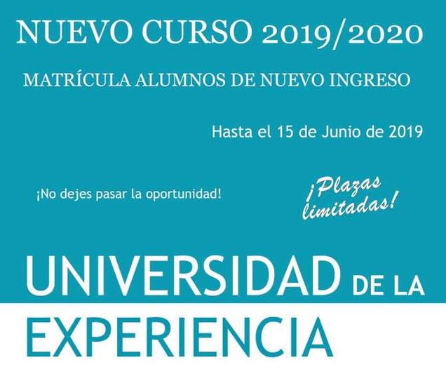 La Universidad de la Experiencia de Benavente abre el plazo de admisión de nuevos alumnos para el curso académico 2019/2020. El periodo de matrícula permanecerá abierto hasta el día 15 de junio de 2019 o hasta agotar las plazas disponibles. La información e inscripciones podrán formalizarse en la sede benaventana, ubicada en el Centro Cultural Soledad González (Biblioteca Municipal), los Martes y Jueves en horario de 17:30 a 20:30 horas. Las plazas son limitadas.
