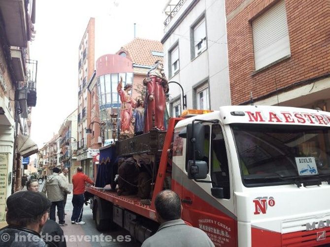Aprovechando la mañana casi soleada, con el permiso de la lluvia prevista y ayudados por grúas han conseguido trasladar las imágenes que procesionarán durante estos días de la Semana de la Pasión.