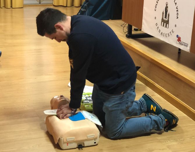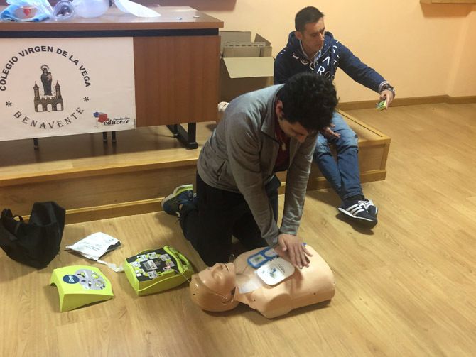 Se trata de un equipo electrónico que sirve para que el corazón de una enfermo que haya sufrido una parada cardiorrespiratoria pueda recuperar su ritmo normal por medio de una descarga eléctrica. Su importancia radica en la inmediatez con la que se actúe sobre el paciente, puesto que las posibilidades de sobrevivir disminuyen considerablemente a medida que transcurren los minutos. En este sentido, y según nuestra legislación autonómica vigente, se requiere una formación previa tanto en el uso del desfibrilador como en las técnicas básicas de primeros auxilios. Por este motivo, siete docentes del claustro de este colegio han asistido a sesiones teóricas y prácticas sobre diversos contenidos: