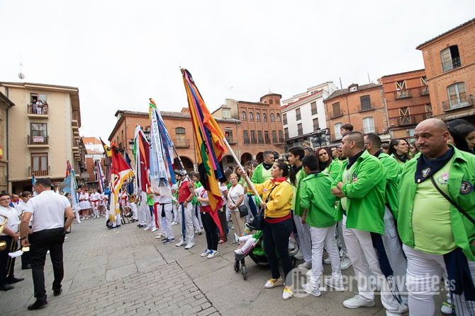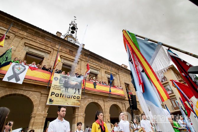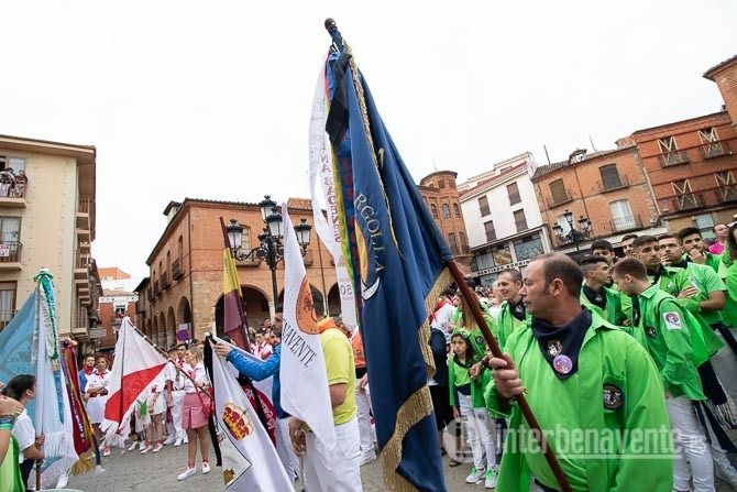 Llegaba el minuto de silencio, la Banda de Música Maestro Lupi, rodeada de las banderas de las peñas oficiales y las de las asociaciones taurinas de la ciudad, interpretaba la pieza Getsemaní, una marcha lenta de Ricardo Dorado. Tras este minuto en el que la plaza solo se oían estas notas, el Alcalde encendía la mecha y se producía el chupinazo, dirección al cielo encapotado que enmarcaba la tarde benaventana, con un claro recuerdo a Santiago.