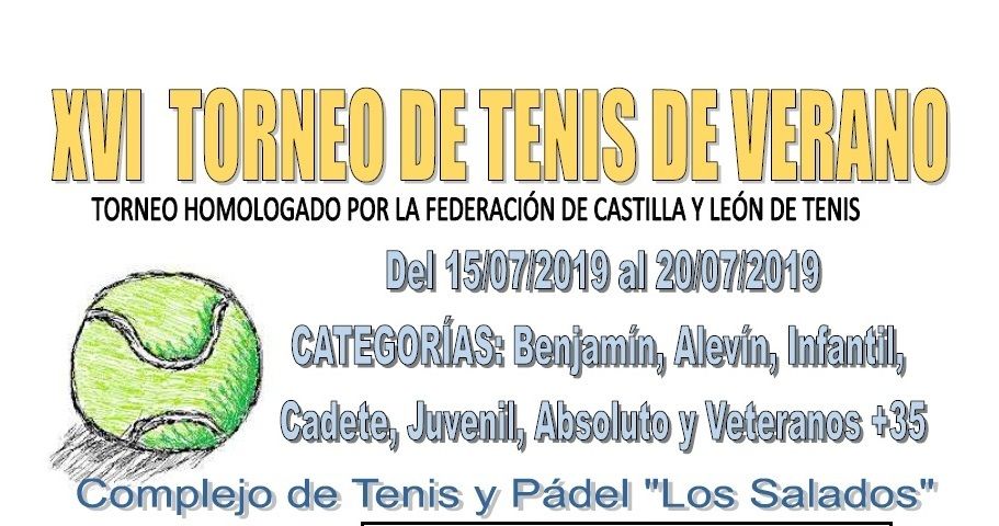 La semana del 15 al 21 de julio tendrá lugar en el Complejo de Tenis y Pádel “Los Salados” el XVI Torneo de Tenis de Verano. Este torneo está homologado por la Federación de Tenis de Castilla y león en categorías infantiles, juveniles, sénior y veteranos.